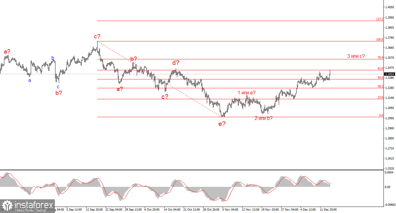 В краткосрочном плане я ожидал построение волны 3 или с с целями, расположенными около отметок 1,3280 и 1,3360, что приравнивается к 76,4% и 61,8% по Фибоначчи. Эти цели достигнуты. Волна 3 или с продолжает свое построение, а текущий набор волн начинает принимать импульсный вид. Следовательно, можно ожидать продолжения повышения котировок с целями, находящимися около 1,3580 и 1,3630.