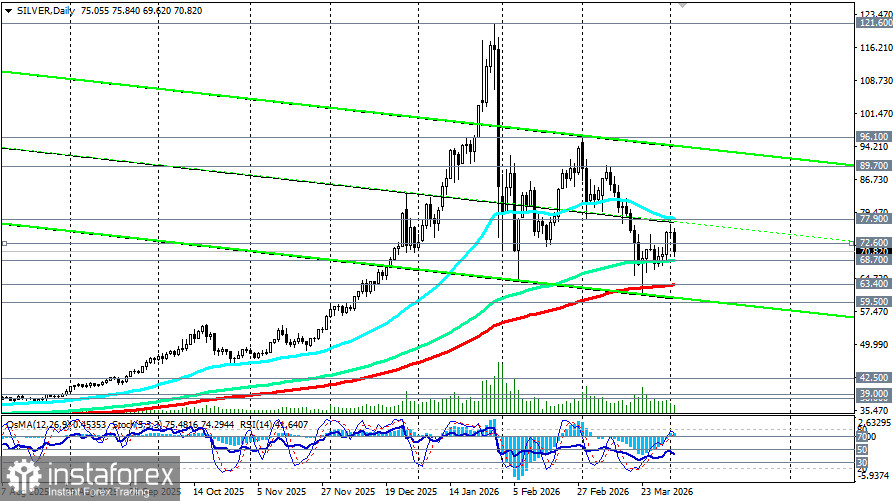 На дневном графике XAG/USD сохраняется восходящая динамика, но картина также ухудшилась. Цена не смогла преодолеть важный уровень сопротивления 77.90 и возобновила снижение к важному среднесрочному уровню поддержки 68.70 (ЕМА144), в то время как RSI опустился ниже 50 и продолжает снижаться, находясь на уровне 41.50.