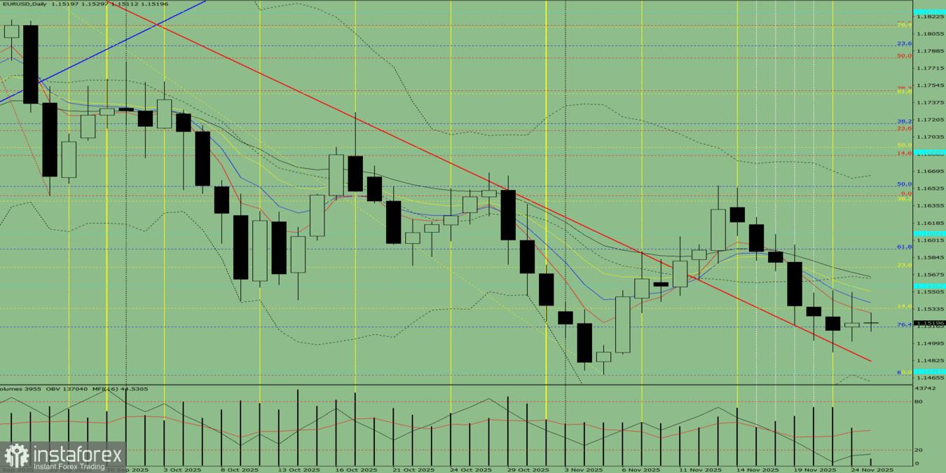 Альтернативный сценарий: цена от уровня 1.1519 (закрытие вчерашней дневной свечи) может продолжить движение вверх с целью 1.1575 – откатный уровень 23.6% (жёлтая пунктирная линия). При тестировании этого уровня цена, возможно, откатит вниз с целью 1.1556 – исторический уровень поддержки (голубая пунктирная линия).