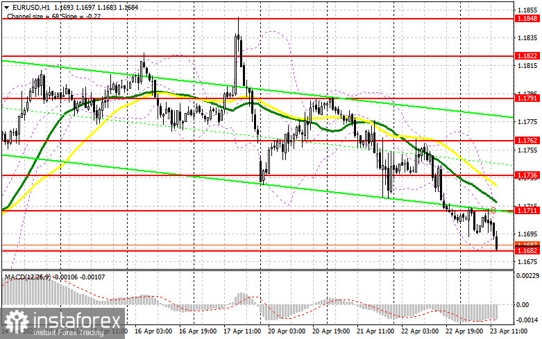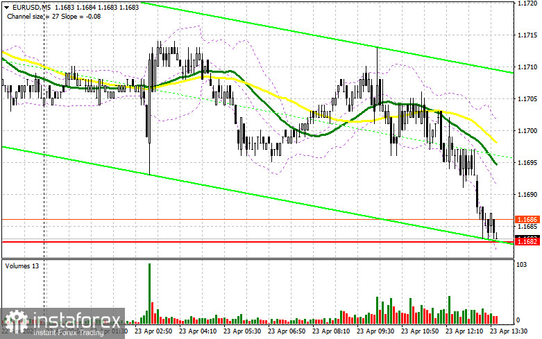 В своем утреннем прогнозе я обращал внимание на уровень 1.1682 и планировал от него принимать решения по входу в рынок. Давайте посмотрим на 5-минутный график и разберемся с тем, что там произошло. Снижение в район 1.1682 произошло, но теста этого уровня в первой половине дня так и не состоялось, так что я остался без сделок. На вторую половину дня техническая картина была немного пересмотрена.