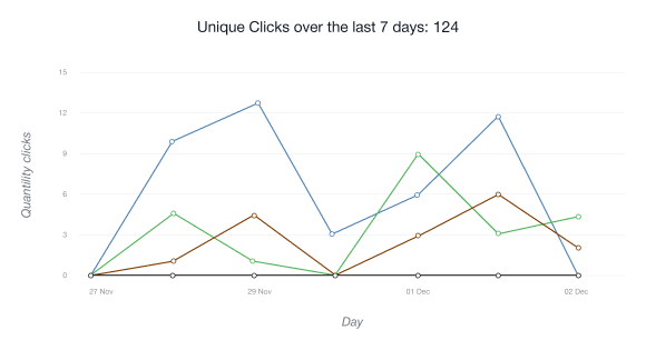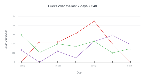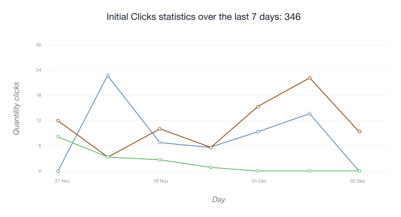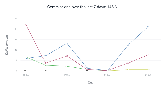• Chart Unique Clicks menunjukkan jumlah pengguna yang mengikuti tautan afiliasi anda untuk pertama kalinya dari alamat IP yang diberikan selama 24 jam terakhir.