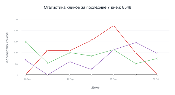• График уникальных кликов по партнерской ссылке показывает число посетителей, которые впервые перешли по ней с определенного IP-адреса в течение последних 24 часов.