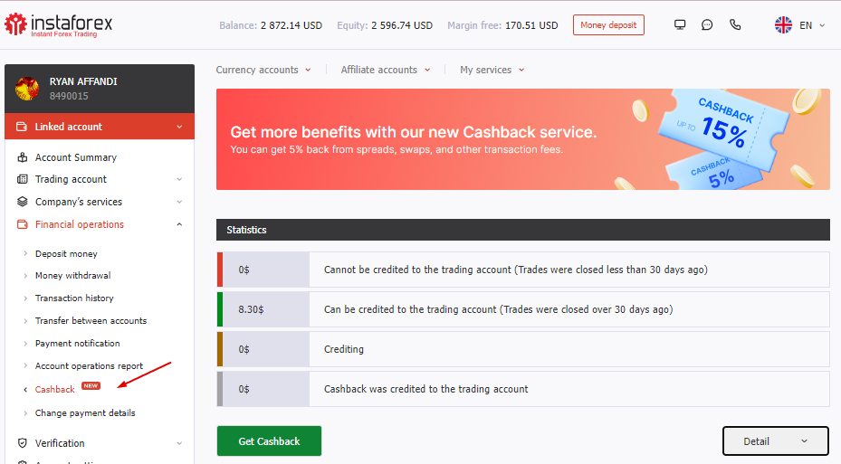 Кешбэк бағдарламасы былай жұмыс істейді: сіз қалыпты режимде сауда жасап, таңдалған құралдар бойынша сауда-саттықтарды жабасыз. Әрбір сауда күнінің соңында жабылған сауда-саттықтар клиенттік кабинетте (КК) көрсетіледі. Кешбэк есептелуіне қатысты барлық өзгерістер КК/Қаржы операциялары/Кешбэк мекен-жайы бойынша бақылауға болады. Осы бөлімде күнделікті барлық транзакциялар көрсетіледі, құрал бойынша және тапсырыс нөмірі бойынша іздеу қолжетімді, сондай-ақ сауда-саттықтарды көрсету кезеңі мен тиісті күйлерді таңдау мүмкіндігі бар.