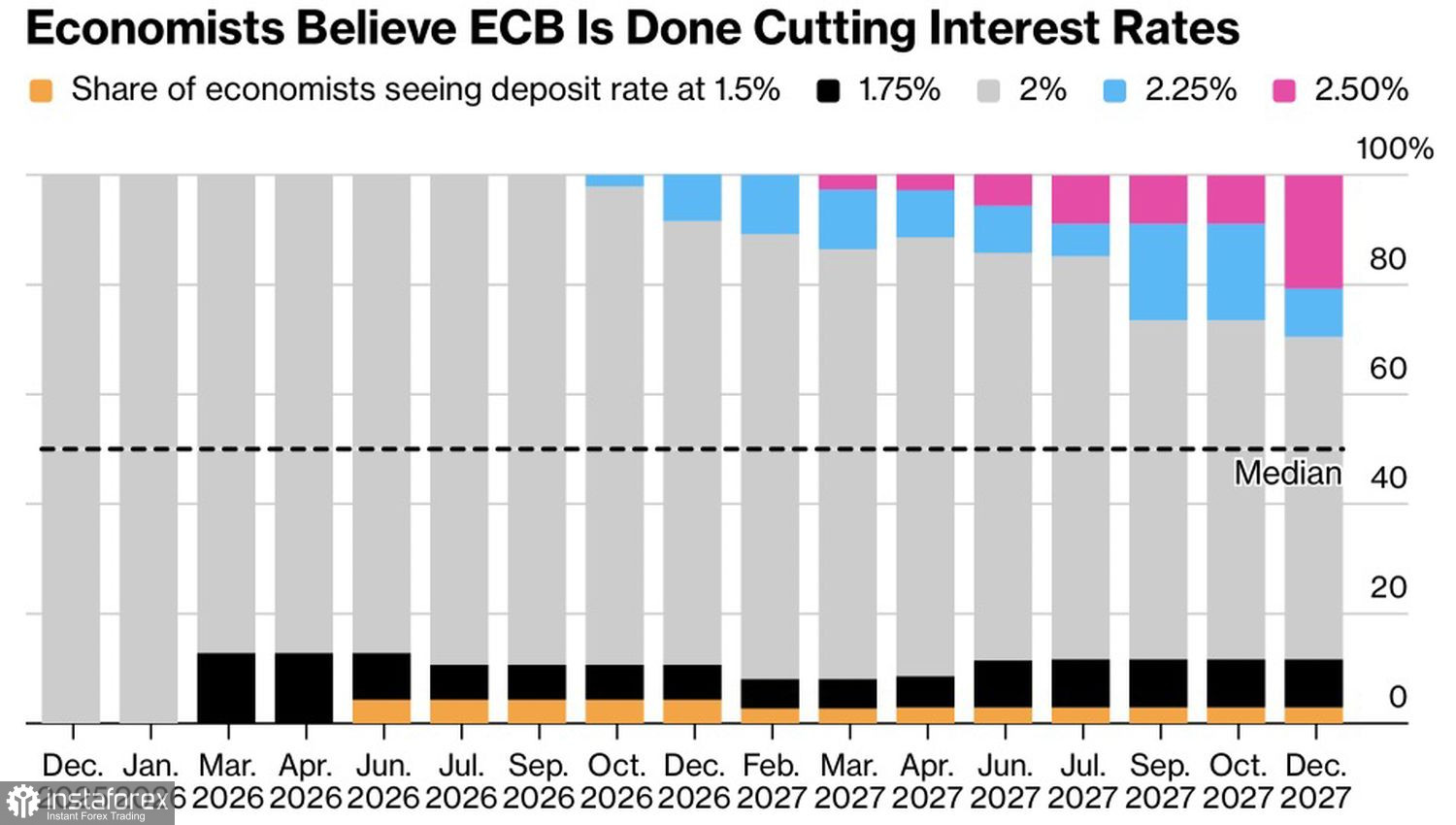 Тем более что эксперты Bloomberg прогнозируют, что ставка по депозитам Европейского центробанка останется на отметке 2% по меньшей мере до 2027. При этом большинство или около 60% респондентов считает, что следующим шагом ЕЦБ будет ужесточение, а не ослабление денежно-кредитной политики.